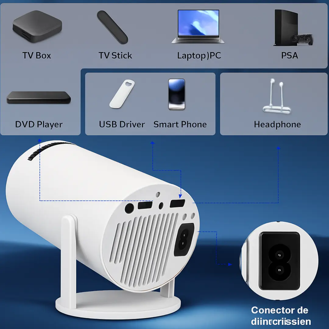Un proyector portátil y versátil, ideal para cine en casa, presentaciones o entretenimiento en cualquier lugar.