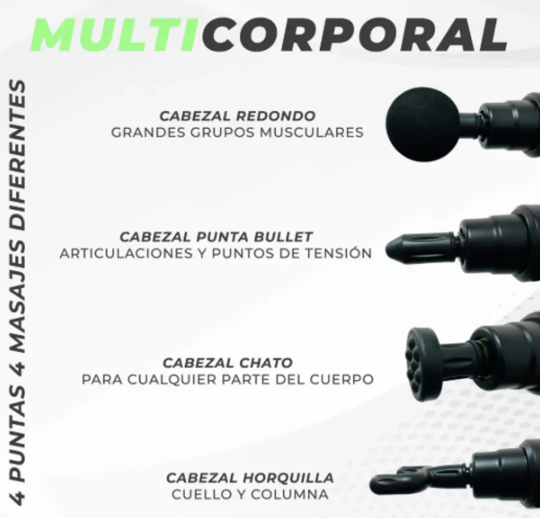 • 4 cabezales intercambiables para diferentes grupos musculares