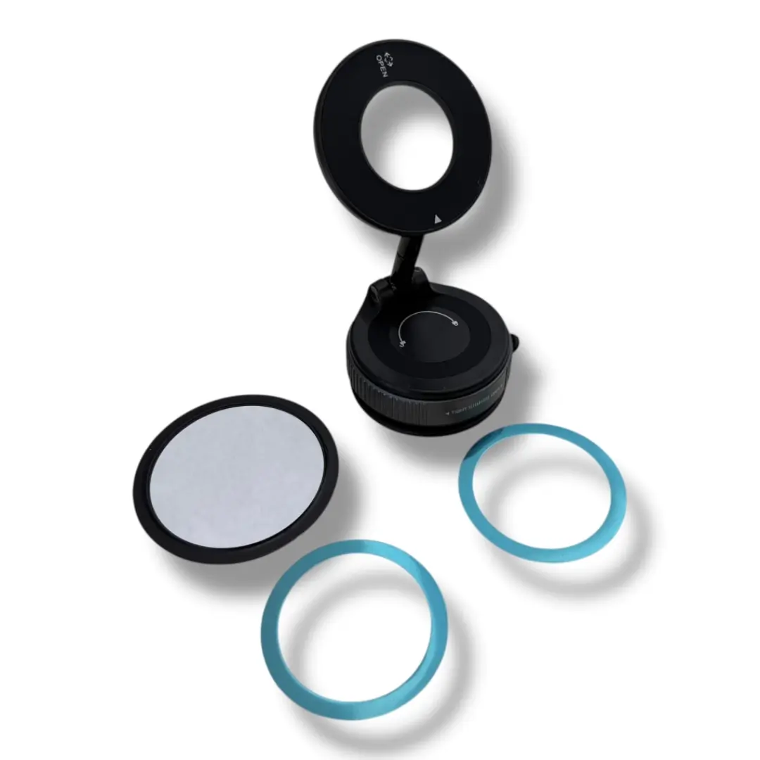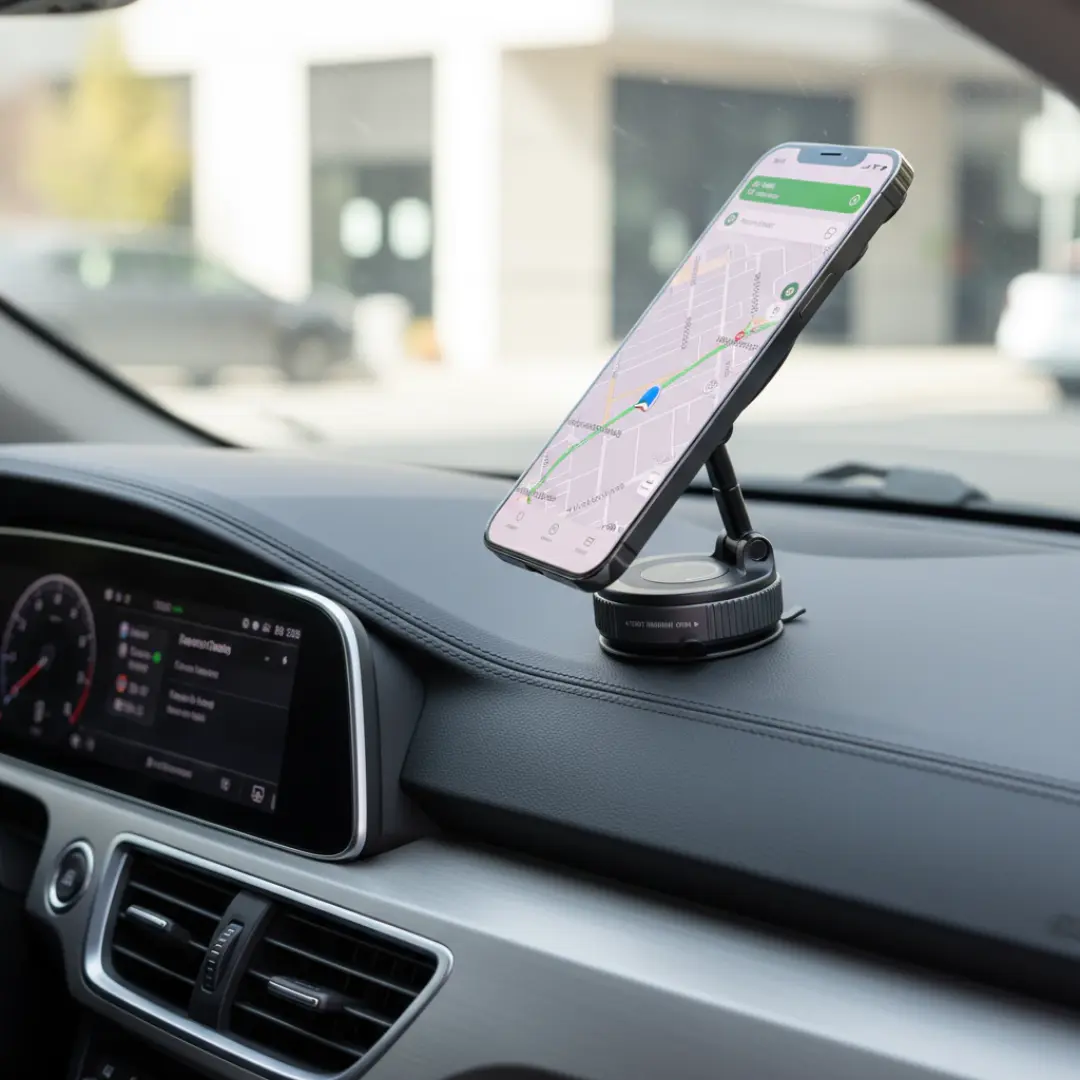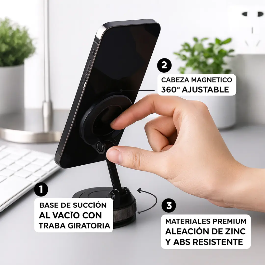 Soporte magnético premium, diseñado para ofrecer una conducción más segura, estable y práctica. Su base de succión garantiza agarre firme en cualquier superficie y su potente imán mantiene tu teléfono siempre seguro y accesible.