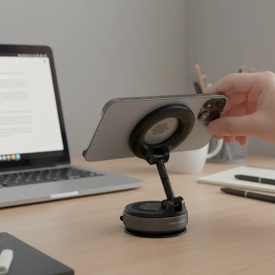 🚗 Base de succión de alta adherencia: se fija en tablero, parabrisas del auto o cualquier superficie lisa.